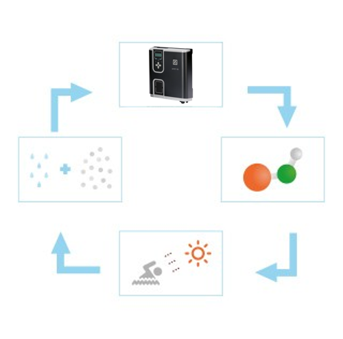 • Le système est cyclique : l’électrolyse ne consomme pas de sel, il n'est donc pas nécessaire d'en rajouter en cours de saison (sauf en cas de renouvellement de l'eau).